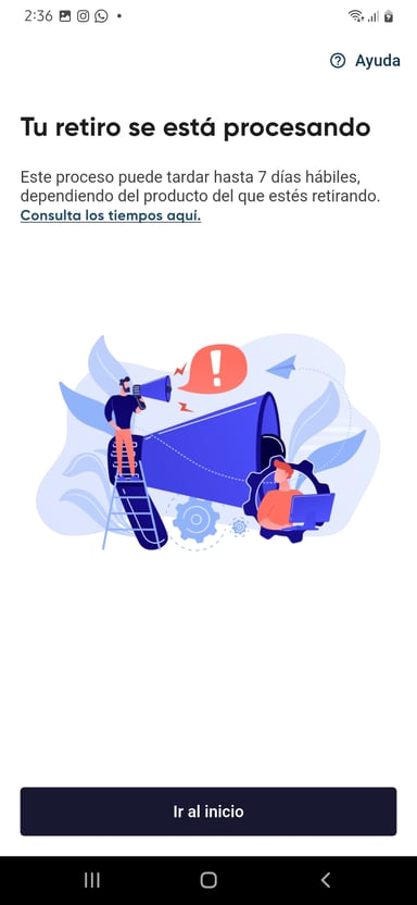 7. La pantalla te mostrará este anunció, significa que la solicitud de retiro se confirmó y entra en proceso. Ten presente que los retiros no se completan de forma automática.